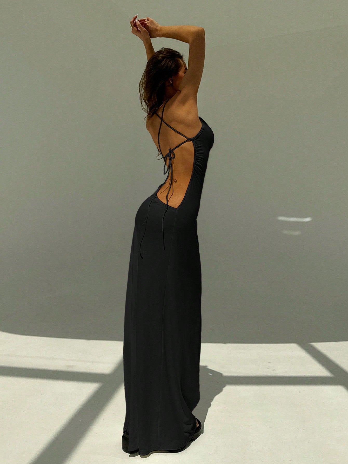 Backless Spaghetti Strap Tight Deep Draped Neck Long Dress For Wome...