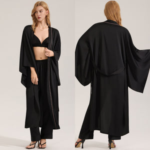 Premium imitation silk polyester (95%+) glides like liquid satin with breathable coolness, ultra-thin 81–100g/m² fabric for weightless feel, and three-piece design (long-sleeve robe, cami top, long pants) that adds layered sophistication while keeping you fresh year-round.