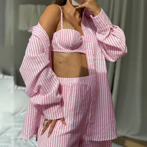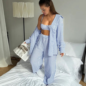 Stop choosing between cozy warmth and breezy comfort. This striped three-piece set solves the "clashing layers" dilemma, providing a perfectly coordinated look that keeps you polished from a late-night movie marathon to a sun-drenched breakfast.