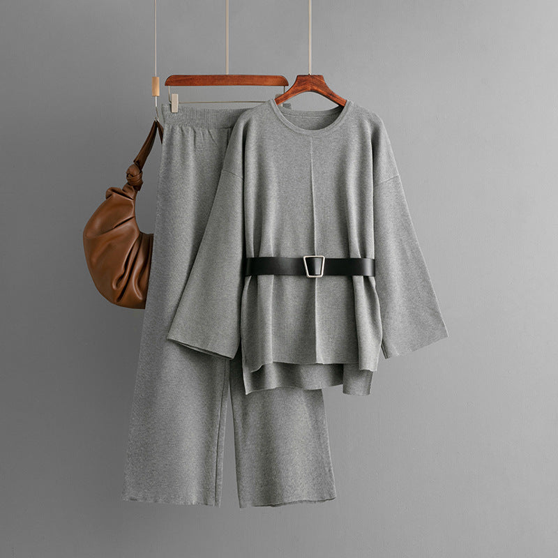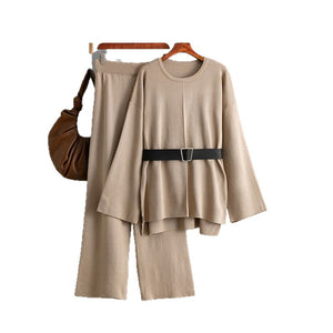 New knitted belt top loose high-waisted wide-leg pants two-piece set