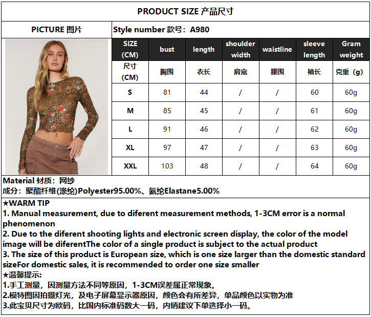 Women's leopard print flower printing mesh yarn crew neck short long-sleeved T-shirt top