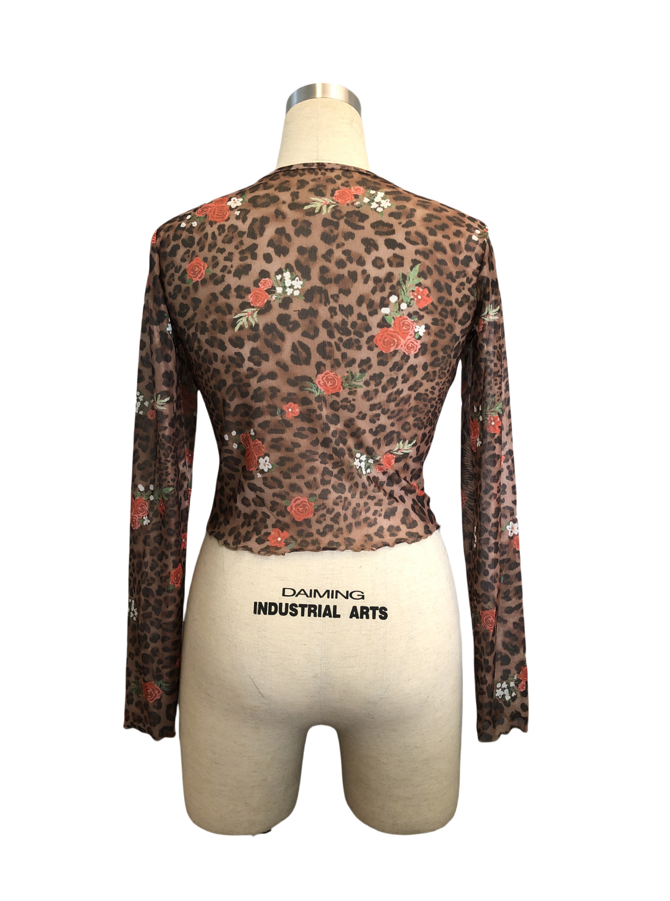 Women's leopard print flower printing mesh yarn crew neck short long - sleeved T-shirt top - Negative Apparel