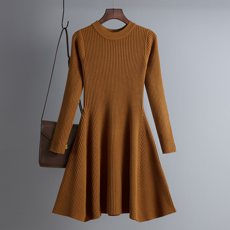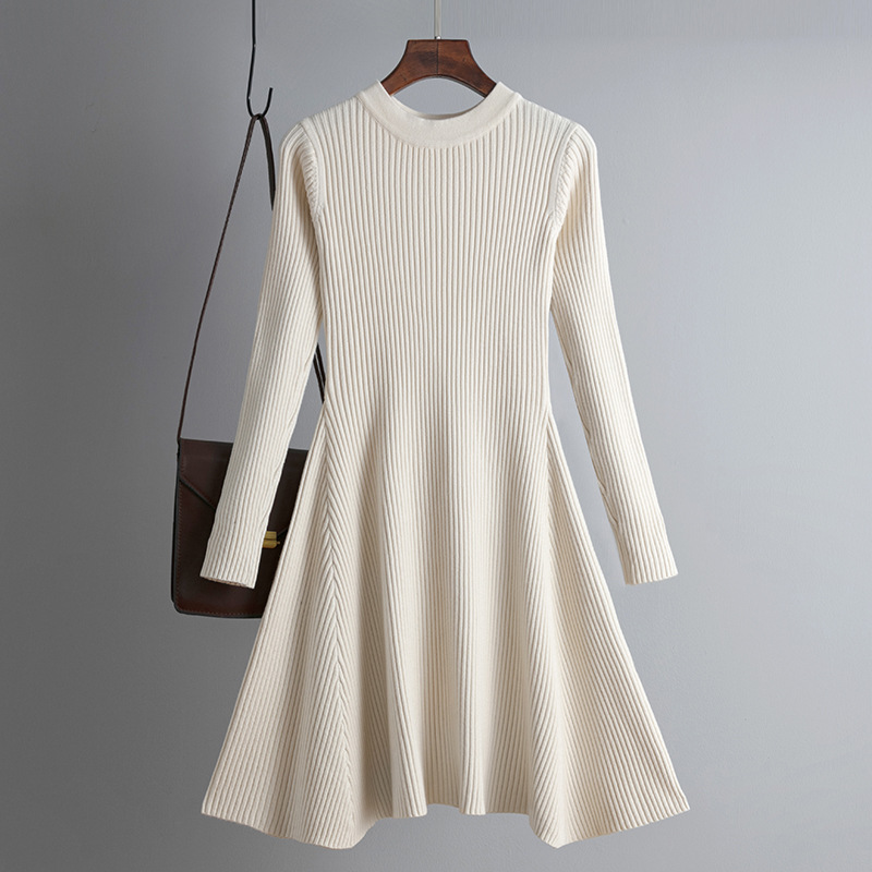Our Solid Color Long-Sleeve Round Neck Knit Midi Dress provides the perfect solution: a premium viscose-polyester knit blend that offers gentle stretch and a soft, luxurious feel, a flattering high-waist A-line silhouette that skims the body gracefully, a classic round neckline for refined simplicity, and long sleeves for cozy coverage that transitions seamlessly through autumn.