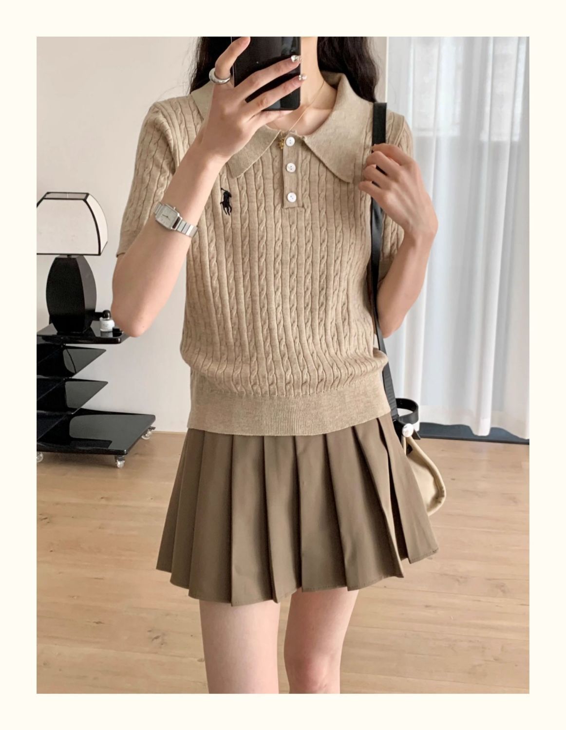 Spring and Summer Polo Neck Knitted Sweater Women's Pony Embroidered Slim Sleeve Short Sleeve T-Shirt Bottom Shirt Vintage Twist Top